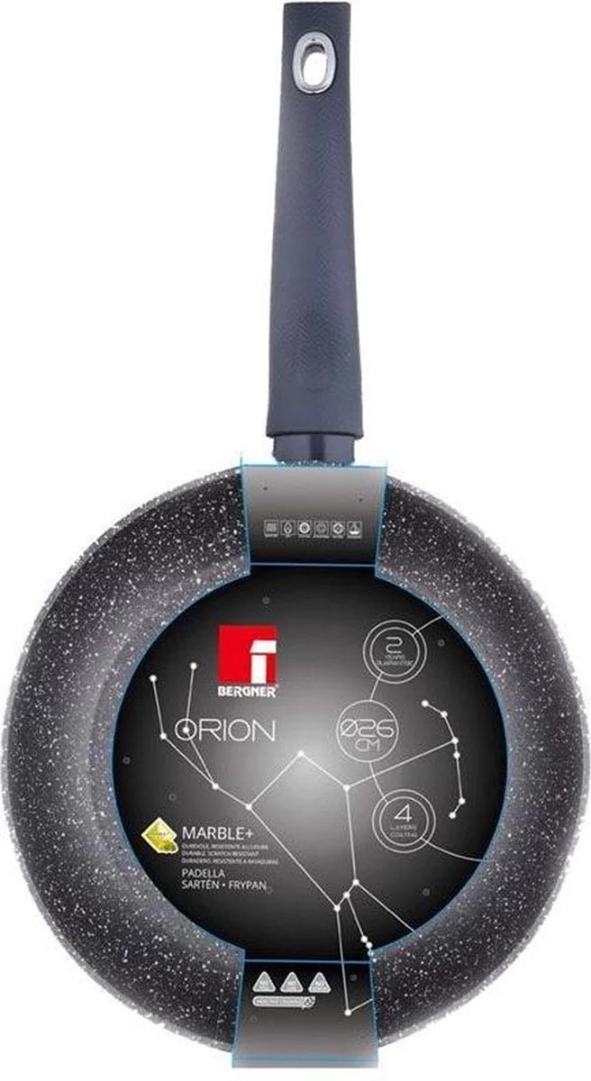 | Aanvullende functies | Vervaardigd uit gesmeed aluminium voor een optimale warmte-geleiding Een duurzame, krasvaste marmer coating van 4 lagen Geschikt voor alle soorten van verwarming, ook inductie Grijze "Soft Touch" handgreep Gezond koken: PFOA-vrij / geen lood / geen cadmium Vaatwasmachine bestendig Afmeting pan: Ø 26cm, hoogte: 5cm Serielijn: Bergner Orion Typenummer: BG-8510-MBG |