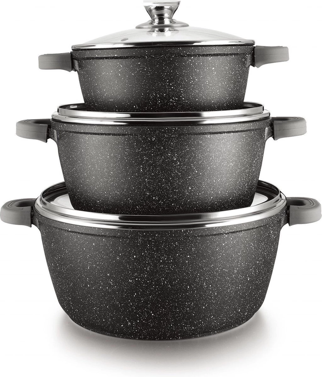 Met deze 6-delige serviesset kunt u de heerlijkste gerechten bereiden. De set bestaat uit drie potten met deksels. De potten zijn gemaakt van gegoten aluminium en hebben een 3-laagse marmeren coating. Ze kunnen worden gebruikt voor alle soorten warmtebronnen.