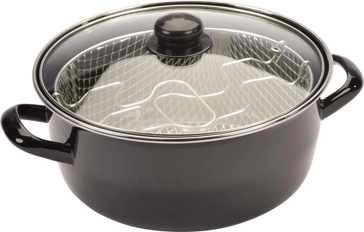 Frituurpan Emaille met Glazen Deksel & Korf – Ø 26 cm.
